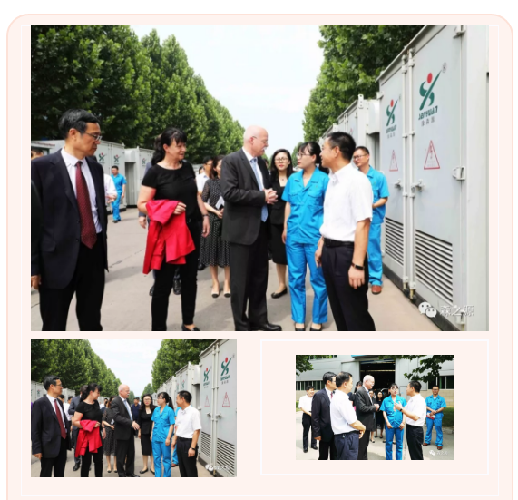 临行时,看到道路两旁摆放整齐,即将发往客户的箱式变电站等产品,葛策先生大感兴趣。他顶着烈日步行十余米,仔细察看并详细询问了产品的参数和生产销售情况。