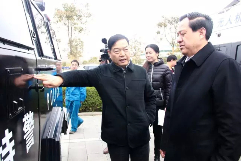 森源集团董事局主席、总裁楚金甫向王书记一行汇报了电气二期厂区建设生产情况和中关村清华科技园森源电动汽车技术研究院建设情况,并现场介绍了公司新研发的无人机、防暴警务车辆、城市环卫车辆等高科技产品的优越性能。在了解到公司最新引进了德国、意大利先进的机器人集成制造装备和在北京成立“两部”、“两院”,吸引清华大学人才增强公司电动汽车研发实力后,王树山对森源集团先进的生产制造能力和蓬勃发展的势头给予了高度评价。