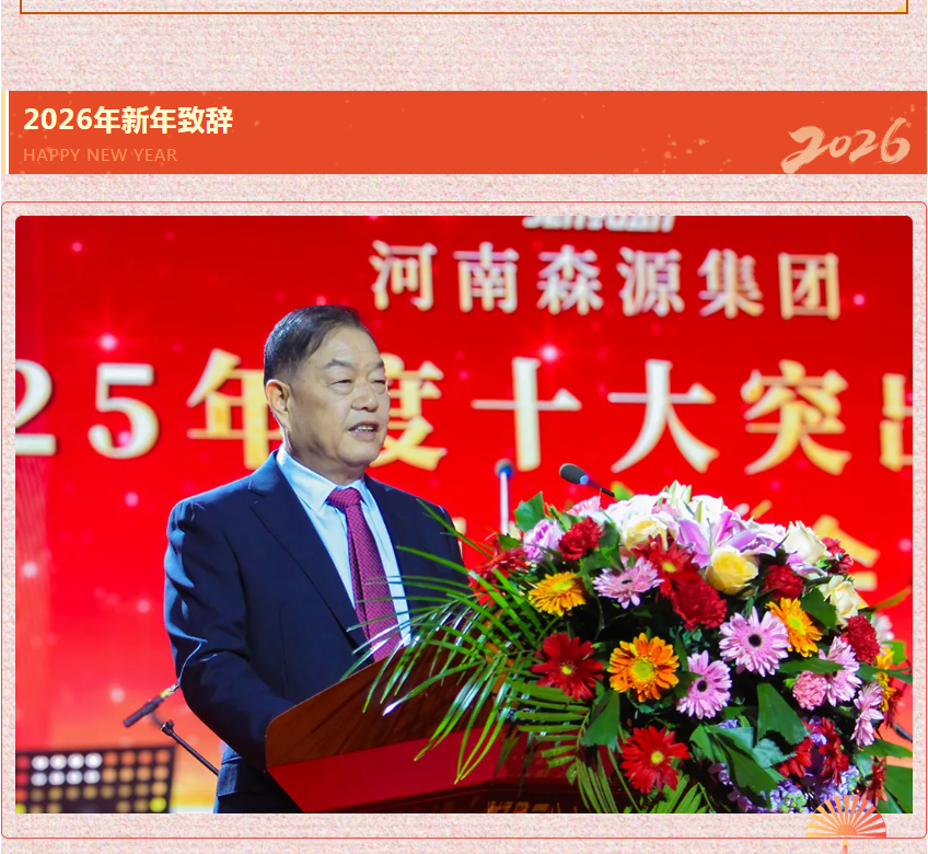 新元肇启,万象更新。森源集团党委书记楚金甫新年致辞,向全体干部员工及社会各界朋友致以诚挚的新年祝福。他回顾了过去一年集团砥砺奋进的历程与来之不易的成绩,明确了2026年的发展目标与重要任务,号召全体森源人接续奋斗,持续巩固公司稳中有升的良好发展势头,为实现森源向新向优的高质量发展而努力奋斗!