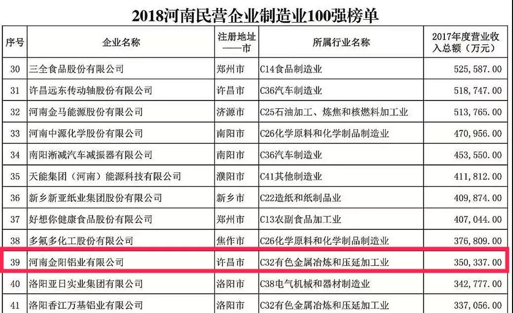 2018“河南民营企业制造业100强”榜单中,森源集团、黄河集团、众品食业、金汇集团和金阳铝业分别排在第3名、第5名、第6名、第7名及第39名。