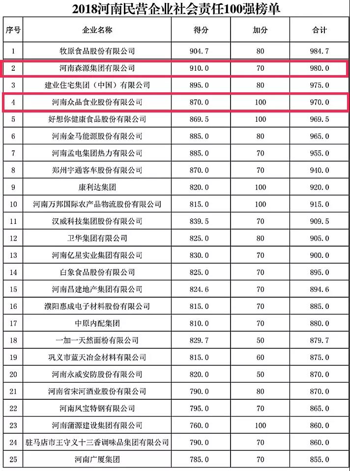 在2018“河南民营企业社会责任100强”榜单中,森源集团、众品食业和宇龙实业分别排在第2名、第4名及第91名;