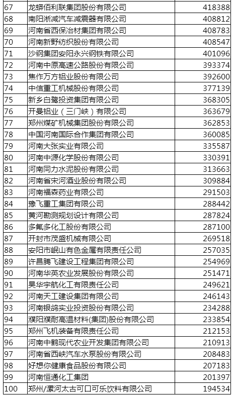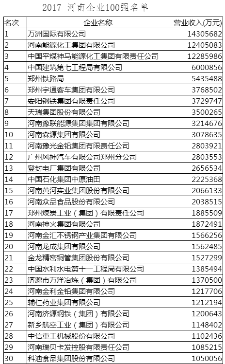 11月22日,河南企业家联合会发布《2017河南企业100强》榜单。据了解,河南省企业联合会、河南省企业家协会在连续发布12年河南企业100强的基础上,今年又在各省辖市企业联合会、企业家协会,全省性行业协会、企业和企业家团体及有关企业的大力支持下,在企业自愿申报为主、采用市场公开数据为辅的基础上,按照国际通行的方式,以2016年企业营业收入为入围标准,经专家审定,推出了“2017河南企业100强”。